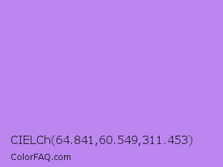 CIELCh 64.841,60.549,311.453 Color is a light violet color and the nearest color is Bright Lavender #bf94e4. Hex code #bb86ef and RGB value is rgb(187,134,239). In RGB color space, this color is composed of 73% red, 53% green, 94% blue, In CMYK color space, this color is composed of 22% cyan, 44% magenta, 0% yellow , 6% black , In HSL color space, this color has a hue angle of 270° , 77% saturation and 73% lightness.