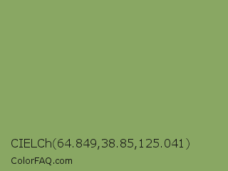 CIELCh 64.849,38.85,125.041 Color is a normal green color and the nearest color is Asparagus #87a96b. Hex code #89a763 and RGB value is rgb(137,167,99). In RGB color space, this color is composed of 54% red, 65% green, 39% blue, In CMYK color space, this color is composed of 18% cyan, 0% magenta, 41% yellow , 35% black , In HSL color space, this color has a hue angle of 86° , 28% saturation and 52% lightness.
