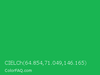 CIELCh 64.854,71.049,146.165 Color is a normal green color and the nearest color is Green Pigment #00a550. Hex code #19b552 and RGB value is rgb(25,181,82). In RGB color space, this color is composed of 10% red, 71% green, 32% blue, In CMYK color space, this color is composed of 86% cyan, 0% magenta, 55% yellow , 29% black , In HSL color space, this color has a hue angle of 142° , 76% saturation and 40% lightness.
