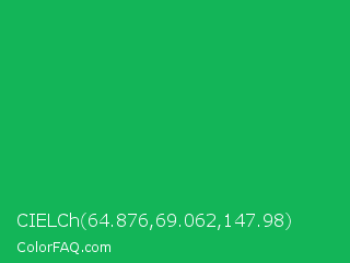 CIELCh 64.876,69.062,147.98 Color is a normal green color and the nearest color is GO Green #00ab66. Hex code #13b558 and RGB value is rgb(19,181,88). In RGB color space, this color is composed of 7% red, 71% green, 35% blue, In CMYK color space, this color is composed of 90% cyan, 0% magenta, 51% yellow , 29% black , In HSL color space, this color has a hue angle of 146° , 81% saturation and 39% lightness.