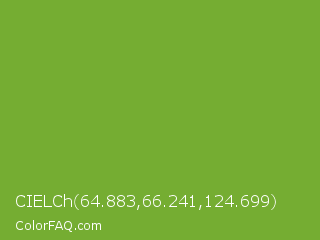 CIELCh 64.883,66.241,124.699 Color is a normal green color and the nearest color is Green RYB #66b032. Hex code #75ad32 and RGB value is rgb(117,173,50). In RGB color space, this color is composed of 46% red, 68% green, 20% blue, In CMYK color space, this color is composed of 32% cyan, 0% magenta, 71% yellow , 32% black , In HSL color space, this color has a hue angle of 87° , 55% saturation and 44% lightness.