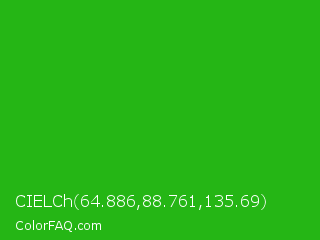 CIELCh 64.886,88.761,135.69 Color is a normal green color and the nearest color is Slimy Green #299617. Hex code #25b615 and RGB value is rgb(37,182,21). In RGB color space, this color is composed of 15% red, 71% green, 8% blue, In CMYK color space, this color is composed of 80% cyan, 0% magenta, 88% yellow , 29% black , In HSL color space, this color has a hue angle of 114° , 79% saturation and 40% lightness.