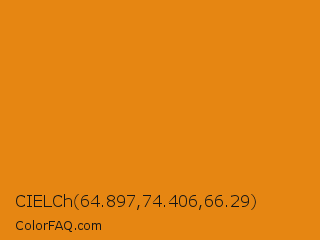 CIELCh 64.897,74.406,66.29 Color is a normal orange color and the nearest color is Golden Bell #e28913. Hex code #e68612 and RGB value is rgb(230,134,18). In RGB color space, this color is composed of 90% red, 53% green, 7% blue, In CMYK color space, this color is composed of 0% cyan, 42% magenta, 92% yellow , 10% black , In HSL color space, this color has a hue angle of 33° , 85% saturation and 49% lightness.