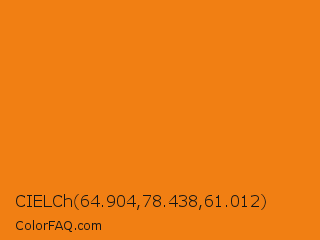 CIELCh 64.904,78.438,61.012 Color is a normal orange color and the nearest color is Tango #ed7a1c. Hex code #f17f13 and RGB value is rgb(241,127,19). In RGB color space, this color is composed of 95% red, 50% green, 7% blue, In CMYK color space, this color is composed of 0% cyan, 47% magenta, 92% yellow , 5% black , In HSL color space, this color has a hue angle of 29° , 89% saturation and 51% lightness.
