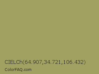 CIELCh 64.907,34.721,106.432 Color is a normal yellow color and the nearest color is Green Smoke #a4af6e. Hex code #a1a161 and RGB value is rgb(161,161,97). In RGB color space, this color is composed of 63% red, 63% green, 38% blue, In CMYK color space, this color is composed of 0% cyan, 0% magenta, 40% yellow , 37% black , In HSL color space, this color has a hue angle of 60° , 25% saturation and 51% lightness.