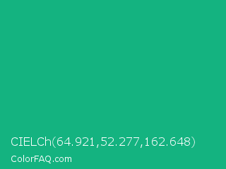 CIELCh 64.921,52.277,162.648 Color is a normal green color and the nearest color is Mountain Meadow Crayola #1ab385. Hex code #14b380 and RGB value is rgb(20,179,128). In RGB color space, this color is composed of 8% red, 70% green, 50% blue, In CMYK color space, this color is composed of 89% cyan, 0% magenta, 28% yellow , 30% black , In HSL color space, this color has a hue angle of 161° , 80% saturation and 39% lightness.