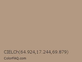 CIELCh 64.924,17.244,69.879 Color is a normal orange color and the nearest color is Mongoose #b5a27f. Hex code #b39981 and RGB value is rgb(179,153,129). In RGB color space, this color is composed of 70% red, 60% green, 51% blue, In CMYK color space, this color is composed of 0% cyan, 15% magenta, 28% yellow , 30% black , In HSL color space, this color has a hue angle of 29° , 25% saturation and 60% lightness.