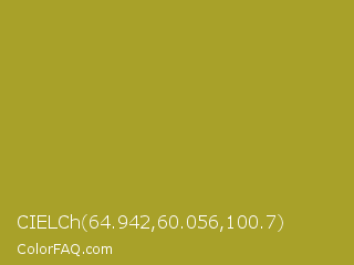 CIELCh 64.942,60.056,100.7 Color is a normal yellow color and the nearest color is Lemon Ginger #ac9e22. Hex code #a8a129 and RGB value is rgb(168,161,41). In RGB color space, this color is composed of 66% red, 63% green, 16% blue, In CMYK color space, this color is composed of 0% cyan, 4% magenta, 76% yellow , 34% black , In HSL color space, this color has a hue angle of 57° , 61% saturation and 41% lightness.