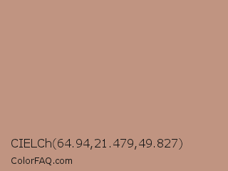 CIELCh 64.94,21.479,49.827 Color is a light orange color and the nearest color is Pale Taupe #bc987e. Hex code #c09481 and RGB value is rgb(192,148,129). In RGB color space, this color is composed of 75% red, 58% green, 51% blue, In CMYK color space, this color is composed of 0% cyan, 23% magenta, 33% yellow , 25% black , In HSL color space, this color has a hue angle of 18° , 33% saturation and 63% lightness.