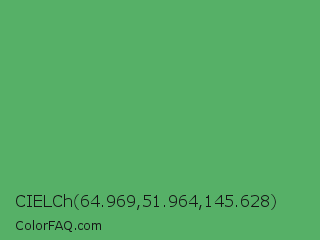 CIELCh 64.969,51.964,145.628 Color is a normal green color and the nearest color is Fern #63b76c. Hex code #56b067 and RGB value is rgb(86,176,103). In RGB color space, this color is composed of 34% red, 69% green, 40% blue, In CMYK color space, this color is composed of 51% cyan, 0% magenta, 41% yellow , 31% black , In HSL color space, this color has a hue angle of 131° , 36% saturation and 51% lightness.