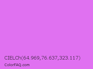 CIELCh 64.969,76.637,323.117 Color is a light magenta color and the nearest color is Heliotrope #df73ff. Hex code #e071f1 and RGB value is rgb(224,113,241). In RGB color space, this color is composed of 88% red, 44% green, 95% blue, In CMYK color space, this color is composed of 7% cyan, 53% magenta, 0% yellow , 5% black , In HSL color space, this color has a hue angle of 292° , 82% saturation and 69% lightness.