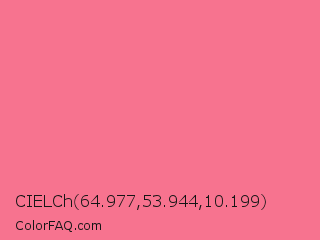 CIELCh 64.977,53.944,10.199 Color is a light red color and the nearest color is Light Crimson #f56991. Hex code #f7738f and RGB value is rgb(247,115,143). In RGB color space, this color is composed of 97% red, 45% green, 56% blue, In CMYK color space, this color is composed of 0% cyan, 53% magenta, 42% yellow , 3% black , In HSL color space, this color has a hue angle of 347° , 89% saturation and 71% lightness.