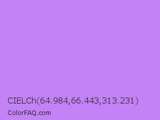 CIELCh 64.984,66.443,313.231 Color is a light purple color and the nearest color is Bright Lavender #bf94e4. Hex code #c282f5 and RGB value is rgb(194,130,245). In RGB color space, this color is composed of 76% red, 51% green, 96% blue, In CMYK color space, this color is composed of 21% cyan, 47% magenta, 0% yellow , 4% black , In HSL color space, this color has a hue angle of 273° , 85% saturation and 74% lightness.