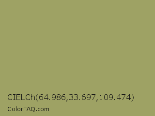 CIELCh 64.986,33.697,109.474 Color is a normal yellow color and the nearest color is Green Smoke #a4af6e. Hex code #9ea264 and RGB value is rgb(158,162,100). In RGB color space, this color is composed of 62% red, 64% green, 39% blue, In CMYK color space, this color is composed of 2% cyan, 0% magenta, 38% yellow , 36% black , In HSL color space, this color has a hue angle of 64° , 25% saturation and 51% lightness.