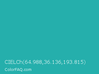 CIELCh 64.988,36.136,193.815 Color is a normal cyan color and the nearest color is Light Sea Green #20b2aa. Hex code #25afac and RGB value is rgb(37,175,172). In RGB color space, this color is composed of 15% red, 69% green, 67% blue, In CMYK color space, this color is composed of 79% cyan, 0% magenta, 2% yellow , 31% black , In HSL color space, this color has a hue angle of 179° , 65% saturation and 42% lightness.