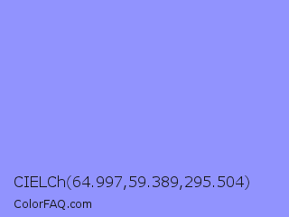 CIELCh 64.997,59.389,295.504 Color is a light blue color and the nearest color is Portage #8b9fee. Hex code #9193fe and RGB value is rgb(145,147,254). In RGB color space, this color is composed of 57% red, 58% green, 100% blue, In CMYK color space, this color is composed of 43% cyan, 42% magenta, 0% yellow , 0% black , In HSL color space, this color has a hue angle of 239° , 98% saturation and 78% lightness.