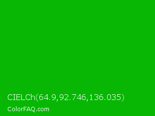 CIELCh 64.9,92.746,136.035 Color is a normal green color and the nearest color is Islamic Green #009000. Hex code #07b704 and RGB value is rgb(7,183,4). In RGB color space, this color is composed of 3% red, 72% green, 2% blue, In CMYK color space, this color is composed of 96% cyan, 0% magenta, 98% yellow , 28% black , In HSL color space, this color has a hue angle of 119° , 96% saturation and 37% lightness.
