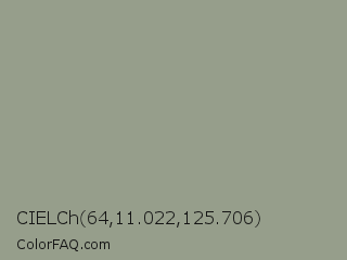 CIELCh 64,11.022,125.706 Color is a normal green color and the nearest color is Lemon Grass #9b9e8f. Hex code #969e8b and RGB value is rgb(150,158,139). In RGB color space, this color is composed of 59% red, 62% green, 55% blue, In CMYK color space, this color is composed of 5% cyan, 0% magenta, 12% yellow , 38% black , In HSL color space, this color has a hue angle of 85° , 9% saturation and 58% lightness.