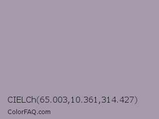 CIELCh 65.003,10.361,314.427 Color is a light purple color and the nearest color is Heliotrope Gray #aa98a9. Hex code #a59aab and RGB value is rgb(165,154,171). In RGB color space, this color is composed of 65% red, 60% green, 67% blue, In CMYK color space, this color is composed of 4% cyan, 10% magenta, 0% yellow , 33% black , In HSL color space, this color has a hue angle of 279° , 9% saturation and 64% lightness.