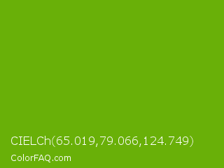 CIELCh 65.019,79.066,124.749 Color is a normal green color and the nearest color is Christi #67a712. Hex code #69b008 and RGB value is rgb(105,176,8). In RGB color space, this color is composed of 41% red, 69% green, 3% blue, In CMYK color space, this color is composed of 40% cyan, 0% magenta, 95% yellow , 31% black , In HSL color space, this color has a hue angle of 85° , 91% saturation and 36% lightness.