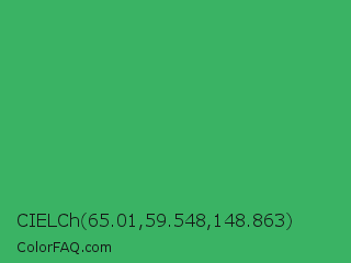 CIELCh 65.01,59.548,148.863 Color is a normal green color and the nearest color is Medium Sea Green #3cb371. Hex code #3ab364 and RGB value is rgb(58,179,100). In RGB color space, this color is composed of 23% red, 70% green, 39% blue, In CMYK color space, this color is composed of 68% cyan, 0% magenta, 44% yellow , 30% black , In HSL color space, this color has a hue angle of 141° , 51% saturation and 46% lightness.