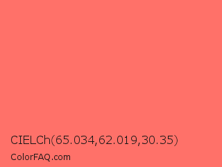 CIELCh 65.034,62.019,30.35 Color is a light red color and the nearest color is Bittersweet #fe6f5e. Hex code #ff7169 and RGB value is rgb(255,113,105). In RGB color space, this color is composed of 100% red, 44% green, 41% blue, In CMYK color space, this color is composed of 0% cyan, 56% magenta, 59% yellow , 0% black , In HSL color space, this color has a hue angle of 3° , 100% saturation and 71% lightness.