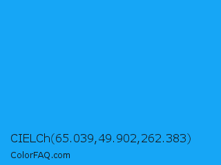 CIELCh 65.039,49.902,262.383 Color is a normal blue color and the nearest color is Button Blue #24a0ed. Hex code #16a6f6 and RGB value is rgb(22,166,246). In RGB color space, this color is composed of 9% red, 65% green, 96% blue, In CMYK color space, this color is composed of 91% cyan, 33% magenta, 0% yellow , 4% black , In HSL color space, this color has a hue angle of 201° , 93% saturation and 53% lightness.
