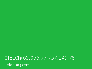 CIELCh 65.056,77.757,141.78 Color is a normal green color and the nearest color is Wageningen Green #34b233. Hex code #1fb640 and RGB value is rgb(31,182,64). In RGB color space, this color is composed of 12% red, 71% green, 25% blue, In CMYK color space, this color is composed of 83% cyan, 0% magenta, 65% yellow , 29% black , In HSL color space, this color has a hue angle of 133° , 71% saturation and 42% lightness.