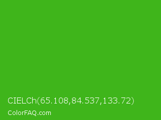 CIELCh 65.108,84.537,133.72 Color is a normal green color and the nearest color is Kelly Green #4cbb17. Hex code #3fb51b and RGB value is rgb(63,181,27). In RGB color space, this color is composed of 25% red, 71% green, 11% blue, In CMYK color space, this color is composed of 65% cyan, 0% magenta, 85% yellow , 29% black , In HSL color space, this color has a hue angle of 106° , 74% saturation and 41% lightness.