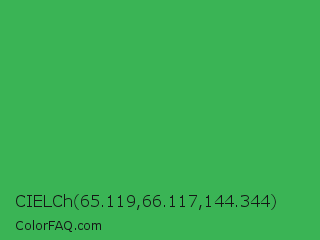 CIELCh 65.119,66.117,144.344 Color is a normal green color and the nearest color is Chateau Green #40a860. Hex code #3ab455 and RGB value is rgb(58,180,85). In RGB color space, this color is composed of 23% red, 71% green, 33% blue, In CMYK color space, this color is composed of 68% cyan, 0% magenta, 53% yellow , 29% black , In HSL color space, this color has a hue angle of 133° , 51% saturation and 47% lightness.