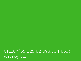 CIELCh 65.125,82.398,134.863 Color is a normal green color and the nearest color is Wageningen Green #34b233. Hex code #3eb525 and RGB value is rgb(62,181,37). In RGB color space, this color is composed of 24% red, 71% green, 15% blue, In CMYK color space, this color is composed of 66% cyan, 0% magenta, 80% yellow , 29% black , In HSL color space, this color has a hue angle of 110° , 66% saturation and 43% lightness.