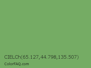 CIELCh 65.127,44.798,135.507 Color is a normal green color and the nearest color is Bud Green #7bb661. Hex code #75ac64 and RGB value is rgb(117,172,100). In RGB color space, this color is composed of 46% red, 67% green, 39% blue, In CMYK color space, this color is composed of 32% cyan, 0% magenta, 42% yellow , 33% black , In HSL color space, this color has a hue angle of 106° , 30% saturation and 53% lightness.