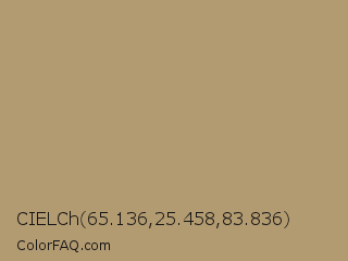 CIELCh 65.136,25.458,83.836 Color is a normal orange color and the nearest color is Desert Camel #c19a6b. Hex code #b39b71 and RGB value is rgb(179,155,113). In RGB color space, this color is composed of 70% red, 61% green, 44% blue, In CMYK color space, this color is composed of 0% cyan, 13% magenta, 37% yellow , 30% black , In HSL color space, this color has a hue angle of 38° , 30% saturation and 57% lightness.
