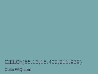 CIELCh 65.13,16.402,211.939 Color is a normal cyan color and the nearest color is Gumbo #7ca1a6. Hex code #77a6ad and RGB value is rgb(119,166,173). In RGB color space, this color is composed of 47% red, 65% green, 68% blue, In CMYK color space, this color is composed of 31% cyan, 4% magenta, 0% yellow , 32% black , In HSL color space, this color has a hue angle of 188° , 25% saturation and 57% lightness.