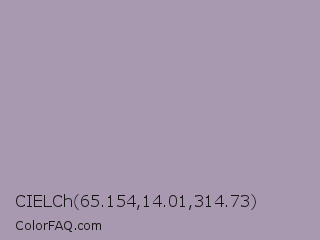 CIELCh 65.154,14.01,314.73 Color is a light purple color and the nearest color is Amethyst Smoke #a397b4. Hex code #a899b0 and RGB value is rgb(168,153,176). In RGB color space, this color is composed of 66% red, 60% green, 69% blue, In CMYK color space, this color is composed of 5% cyan, 13% magenta, 0% yellow , 31% black , In HSL color space, this color has a hue angle of 279° , 13% saturation and 65% lightness.