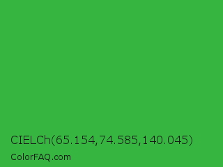 CIELCh 65.154,74.585,140.045 Color is a normal green color and the nearest color is Wageningen Green #34b233. Hex code #37b541 and RGB value is rgb(55,181,65). In RGB color space, this color is composed of 22% red, 71% green, 25% blue, In CMYK color space, this color is composed of 70% cyan, 0% magenta, 64% yellow , 29% black , In HSL color space, this color has a hue angle of 125° , 53% saturation and 46% lightness.
