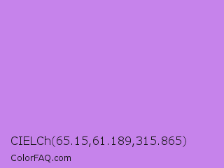 CIELCh 65.15,61.189,315.865 Color is a light purple color and the nearest color is Bright Lavender #bf94e4. Hex code #c683eb and RGB value is rgb(198,131,235). In RGB color space, this color is composed of 78% red, 51% green, 92% blue, In CMYK color space, this color is composed of 16% cyan, 44% magenta, 0% yellow , 8% black , In HSL color space, this color has a hue angle of 279° , 72% saturation and 72% lightness.