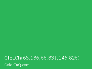 CIELCh 65.186,66.831,146.826 Color is a normal green color and the nearest color is Chateau Green #40a860. Hex code #2bb559 and RGB value is rgb(43,181,89). In RGB color space, this color is composed of 17% red, 71% green, 35% blue, In CMYK color space, this color is composed of 76% cyan, 0% magenta, 51% yellow , 29% black , In HSL color space, this color has a hue angle of 140° , 62% saturation and 44% lightness.