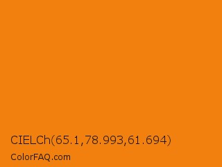 CIELCh 65.1,78.993,61.694 Color is a normal orange color and the nearest color is Tahiti Gold #e97c07. Hex code #f1800f and RGB value is rgb(241,128,15). In RGB color space, this color is composed of 95% red, 50% green, 6% blue, In CMYK color space, this color is composed of 0% cyan, 47% magenta, 94% yellow , 5% black , In HSL color space, this color has a hue angle of 30° , 89% saturation and 50% lightness.