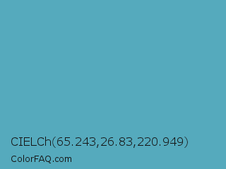 CIELCh 65.243,26.83,220.949 Color is a normal cyan color and the nearest color is Fountain Blue #56b4be. Hex code #55aabd and RGB value is rgb(85,170,189). In RGB color space, this color is composed of 33% red, 67% green, 74% blue, In CMYK color space, this color is composed of 55% cyan, 10% magenta, 0% yellow , 26% black , In HSL color space, this color has a hue angle of 191° , 44% saturation and 54% lightness.