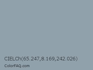 CIELCh 65.247,8.169,242.026 Color is a light blue color and the nearest color is Cadet Grey #91a3b0. Hex code #90a1ab and RGB value is rgb(144,161,171). In RGB color space, this color is composed of 56% red, 63% green, 67% blue, In CMYK color space, this color is composed of 16% cyan, 6% magenta, 0% yellow , 33% black , In HSL color space, this color has a hue angle of 202° , 14% saturation and 62% lightness.