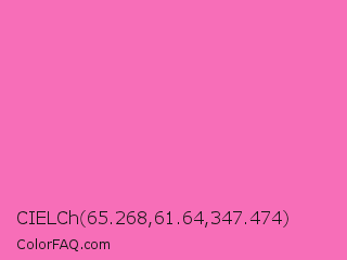 CIELCh 65.268,61.64,347.474 Color is a light rose color and the nearest color is Hot Pink #ff69b4. Hex code #f76eb8 and RGB value is rgb(247,110,184). In RGB color space, this color is composed of 97% red, 43% green, 72% blue, In CMYK color space, this color is composed of 0% cyan, 55% magenta, 26% yellow , 3% black , In HSL color space, this color has a hue angle of 328° , 90% saturation and 70% lightness.