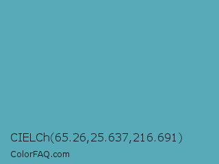 CIELCh 65.26,25.637,216.691 Color is a normal cyan color and the nearest color is Fountain Blue #56b4be. Hex code #59aab9 and RGB value is rgb(89,170,185). In RGB color space, this color is composed of 35% red, 67% green, 73% blue, In CMYK color space, this color is composed of 52% cyan, 8% magenta, 0% yellow , 27% black , In HSL color space, this color has a hue angle of 189° , 41% saturation and 54% lightness.