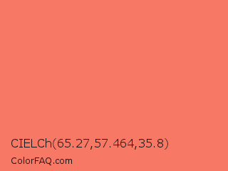 CIELCh 65.27,57.464,35.8 Color is a light red color and the nearest color is Coral Reef Hipster Salmon #fd7c6e. Hex code #f77965 and RGB value is rgb(247,121,101). In RGB color space, this color is composed of 97% red, 47% green, 40% blue, In CMYK color space, this color is composed of 0% cyan, 51% magenta, 59% yellow , 3% black , In HSL color space, this color has a hue angle of 8° , 90% saturation and 68% lightness.