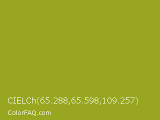 CIELCh 65.288,65.598,109.257 Color is a normal yellow color and the nearest color is Citron #9fa91f. Hex code #98a71f and RGB value is rgb(152,167,31). In RGB color space, this color is composed of 60% red, 65% green, 12% blue, In CMYK color space, this color is composed of 9% cyan, 0% magenta, 81% yellow , 35% black , In HSL color space, this color has a hue angle of 67° , 69% saturation and 39% lightness.