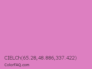 CIELCh 65.28,48.886,337.422 Color is a light magenta color and the nearest color is Middle Purple #d982b5. Hex code #dd7fc1 and RGB value is rgb(221,127,193). In RGB color space, this color is composed of 87% red, 50% green, 76% blue, In CMYK color space, this color is composed of 0% cyan, 43% magenta, 13% yellow , 13% black , In HSL color space, this color has a hue angle of 318° , 58% saturation and 68% lightness.