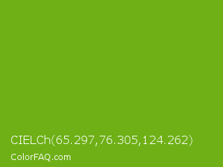 CIELCh 65.297,76.305,124.262 Color is a normal green color and the nearest color is Christi #67a712. Hex code #6eb016 and RGB value is rgb(110,176,22). In RGB color space, this color is composed of 43% red, 69% green, 9% blue, In CMYK color space, this color is composed of 38% cyan, 0% magenta, 88% yellow , 31% black , In HSL color space, this color has a hue angle of 86° , 78% saturation and 39% lightness.