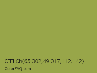 CIELCh 65.302,49.317,112.142 Color is a normal yellow color and the nearest color is Sushi #87ab39. Hex code #98a649 and RGB value is rgb(152,166,73). In RGB color space, this color is composed of 60% red, 65% green, 29% blue, In CMYK color space, this color is composed of 8% cyan, 0% magenta, 56% yellow , 35% black , In HSL color space, this color has a hue angle of 69° , 39% saturation and 47% lightness.
