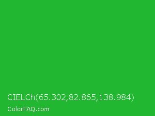 CIELCh 65.302,82.865,138.984 Color is a normal green color and the nearest color is Wageningen Green #34b233. Hex code #22b731 and RGB value is rgb(34,183,49). In RGB color space, this color is composed of 13% red, 72% green, 19% blue, In CMYK color space, this color is composed of 81% cyan, 0% magenta, 73% yellow , 28% black , In HSL color space, this color has a hue angle of 126° , 69% saturation and 43% lightness.