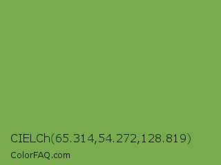 CIELCh 65.314,54.272,128.819 Color is a normal green color and the nearest color is Asparagus Green #7ba05b. Hex code #78ad4f and RGB value is rgb(120,173,79). In RGB color space, this color is composed of 47% red, 68% green, 31% blue, In CMYK color space, this color is composed of 31% cyan, 0% magenta, 54% yellow , 32% black , In HSL color space, this color has a hue angle of 94° , 37% saturation and 49% lightness.